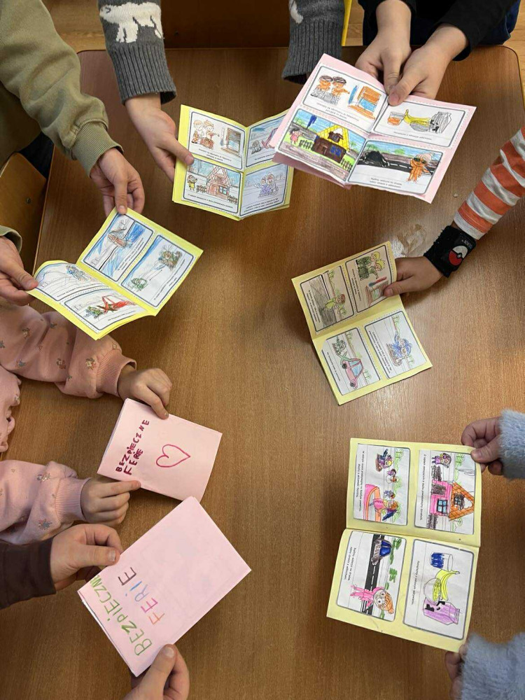 Dzieci z dużym zaangażowaniem tworzyły własne książeczki o bezpieczeństwie oraz kolorowe plakaty, które ozdobiły tablice w salach świetlicowych. Dzięki różnorodnym formom aktywności nauka stała się przyjemna i interesująca.