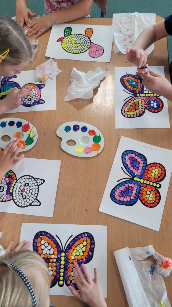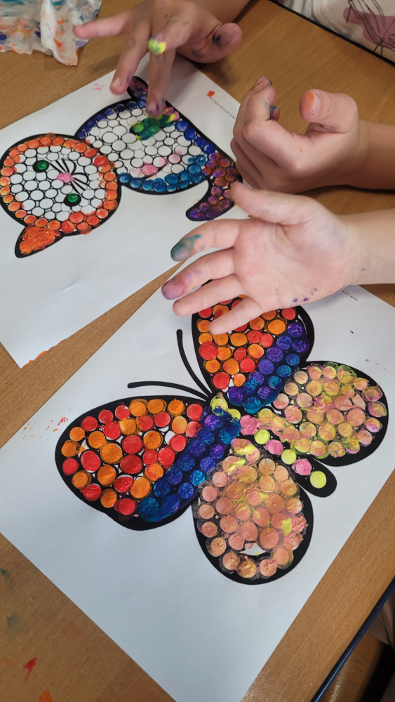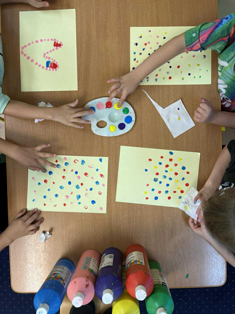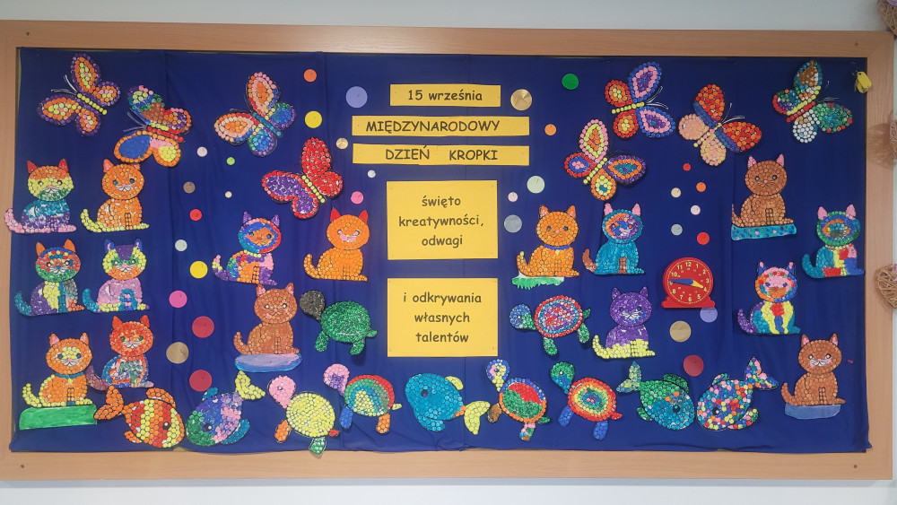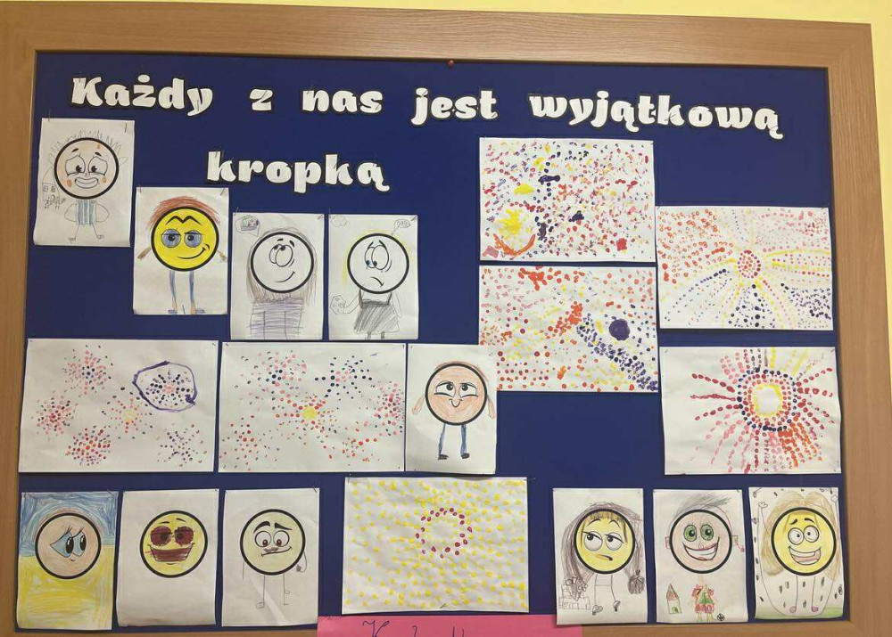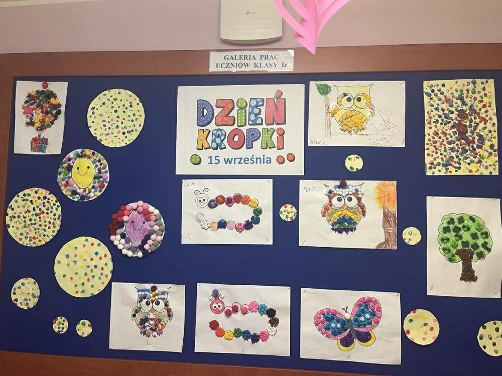 Międzynarodowy Dzień Kropki to święto kreatywności, odwagi i odkrywania własnych talentów. Zajęcia w tym dniu, który przypada na 15 września rozpoczęły się opowieścią o magicznej kropce, historii „Lilki i Magicznej Kropki”, opowieści nawiązującej do idei tego święta. Jego historia jest niezwykle ciekawa. Uczniowie poznali również historię powstania tego dnia, gdzie wszystko zaczęło się od książki "The Dot", której autorem jest Peter Reynolds. Vashti, główna bohaterka nie do końca wierzy w swoje umiejętności plastyczne. Spotyka ona na swojej drodze cudowną nauczycielkę, która dodaje jej odwagi oraz motywuje z pomocą niewielkiej kropki, co zmienia cały świat dziewczynki. "The Dot" to pełna ciepła opowieść o tym, jak ważna jest kreatywność i wsparcie innych. Rozmowa na temat treści wysłuchanych opowieści była inspiracją dla uczniów i wzbudziła chęć podjęcia licznych kreatywnych działań i zabaw z użyciem symbolicznej kropki. Zwieńczeniem zajęć była praca plastyczna oraz sporządzona wystawa w sali świetlicowej.