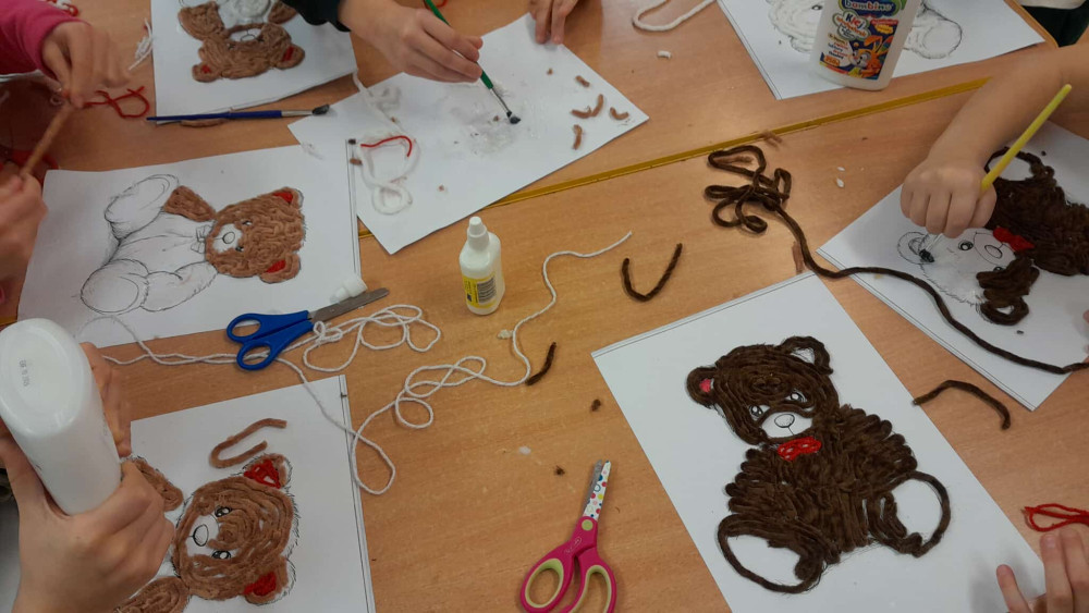 Na początku zajęć dzieci poznały historię pluszowego misia – dowiedziały się, skąd wzięło się to święto oraz dlaczego miś stał się jedną z najbardziej lubianych i ponadczasowych zabawek dzieci na całym świecie. Rozmowa wzbudziła duże zainteresowanie, a dzieci chętnie dzieliły się opowieściami o swoich ulubionych pluszakach.