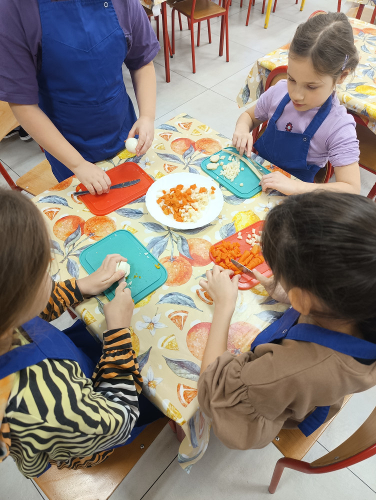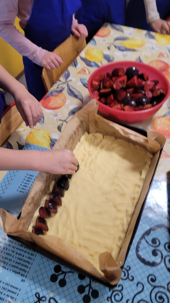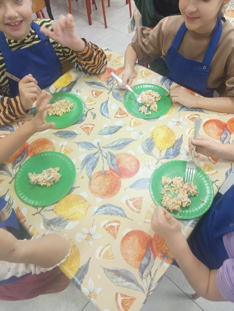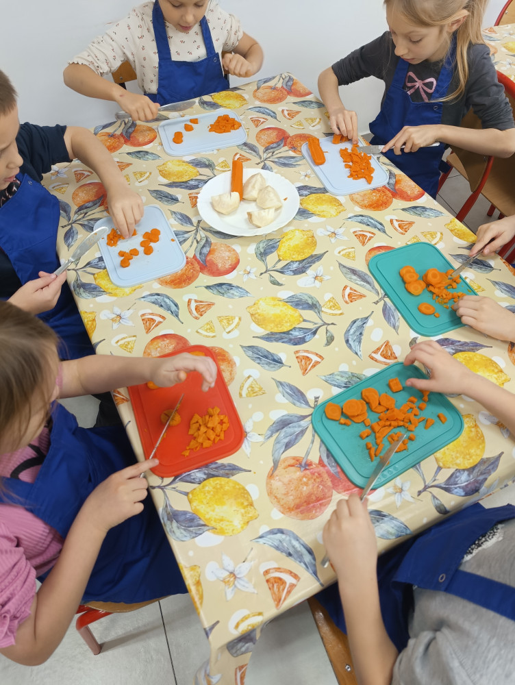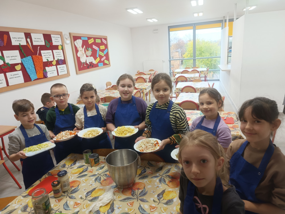 We wrześniu przygotowaliśmy pyszne kruche ciasto ze śliwkami, a w październiku – tradycyjną sałatkę jarzynową. Wszystkie potrawy dzieci wykonują samodzielnie – od krojenia i mieszania, aż po dekorowanie. Uczniowie z ogromnym zaangażowaniem biorą udział w zajęciach, a efekty ich pracy są nie tylko piękne, ale przede wszystkim bardzo smaczne! Nawet największe niejadki z ciekawością i apetytem próbują przygotowanych przysmaków.