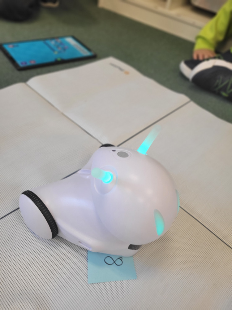 Dla wielu uczniów była to pierwsza okazja do pracy z robotami Photon, co dodatkowo zwiększało ich zaangażowanie i ciekawość. Photon to nowoczesny robot edukacyjny, który w przystępny i atrakcyjny sposób wprowadza dzieci w świat kodowania. Dzięki specjalnej aplikacji uczniowie mogą sterować jego ruchem, tworzyć własne programy oraz rozwiązywać gotowe zadania o różnym stopniu trudności. Robot reaguje na polecenia, świeci różnymi kolorami oraz wydaje dźwięki, co czyni naukę jeszcze bardziej interesującą i angażującą.