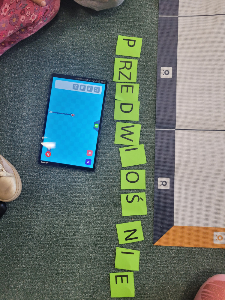 Głównym zadaniem uczniów było zaprogramowanie robota w taki sposób, aby poruszał się po macie według wyznaczonej trasy i docierał do wskazanych pól. Na każdym z nich znajdowały się kartki z numerami, a na ich odwrocie ukryte były litery. Dzięki poprawnemu zaplanowaniu ruchów robota dzieci stopniowo odkrywały kolejne elementy układanki. Następnie, korzystając z rozsypanki literowej, układały wyrazy związane z aktualną porą roku, takie jak „przebiśniegi”, „przedwiośnie”, „skowronek” czy „przylaszczka”.