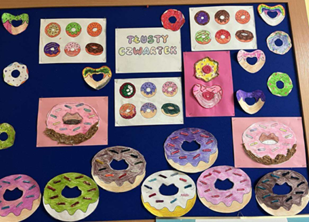 Szczególnie wyczekiwanym dniem był Tłusty Czwartek. Uczniowie poznali tradycje związane z tym słodkim świętem oraz dowiedzieli się, skąd wzięła się tradycja jedzenia pączków. W ramach zajęć plastycznych dzieci wykonały kolorowe pączki z wykorzystaniem włóczki i farb, wykazując się ogromną pomysłowością i starannością. Nie zabrakło również prawdziwej degustacji – wspólnie zajadaliśmy się pysznymi pączkami i innymi słodkościami, celebrując ten dzień w radosnej atmosferze.